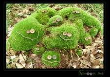 Il trouve des mousses dans la forêt, en compose des petits personnages végétals, qu'il photographie et monte en cartes postales.